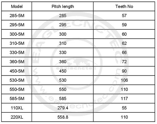 220XL, 110XL, HTD180-5M(10mm width), HTD225-5M(10mm width), HTD280-5M, HTD285-5M, HTD300-5M, HTD310-5M, HTD330-5M(14.5mm width), HTD360-5M(18mm width), HTD400-5M(20mm width), HTD460-5M(18mm width), HTD475-5M(30mm width), HTD530-5M(13.2mm width), HTD550-5M(10mm width), HTD550-5M(11mm width), HTD550-5M(13mm width), HTD560-5M(13mm width), HTD575-5M(13mm width), HTD580-5M(18mm width), HTD585-5M(18mm width)